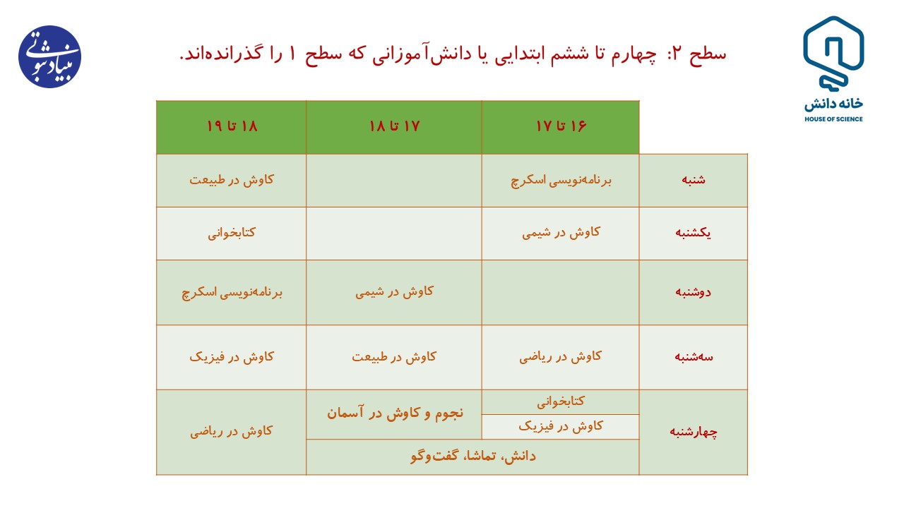 جزئیات برنامهی دورههای کاوش علمی برای ردههای سنی مختلف را در چهار جدول پایین ببینید. برای مشاهده، روی هر برنامه کلیک کنید.